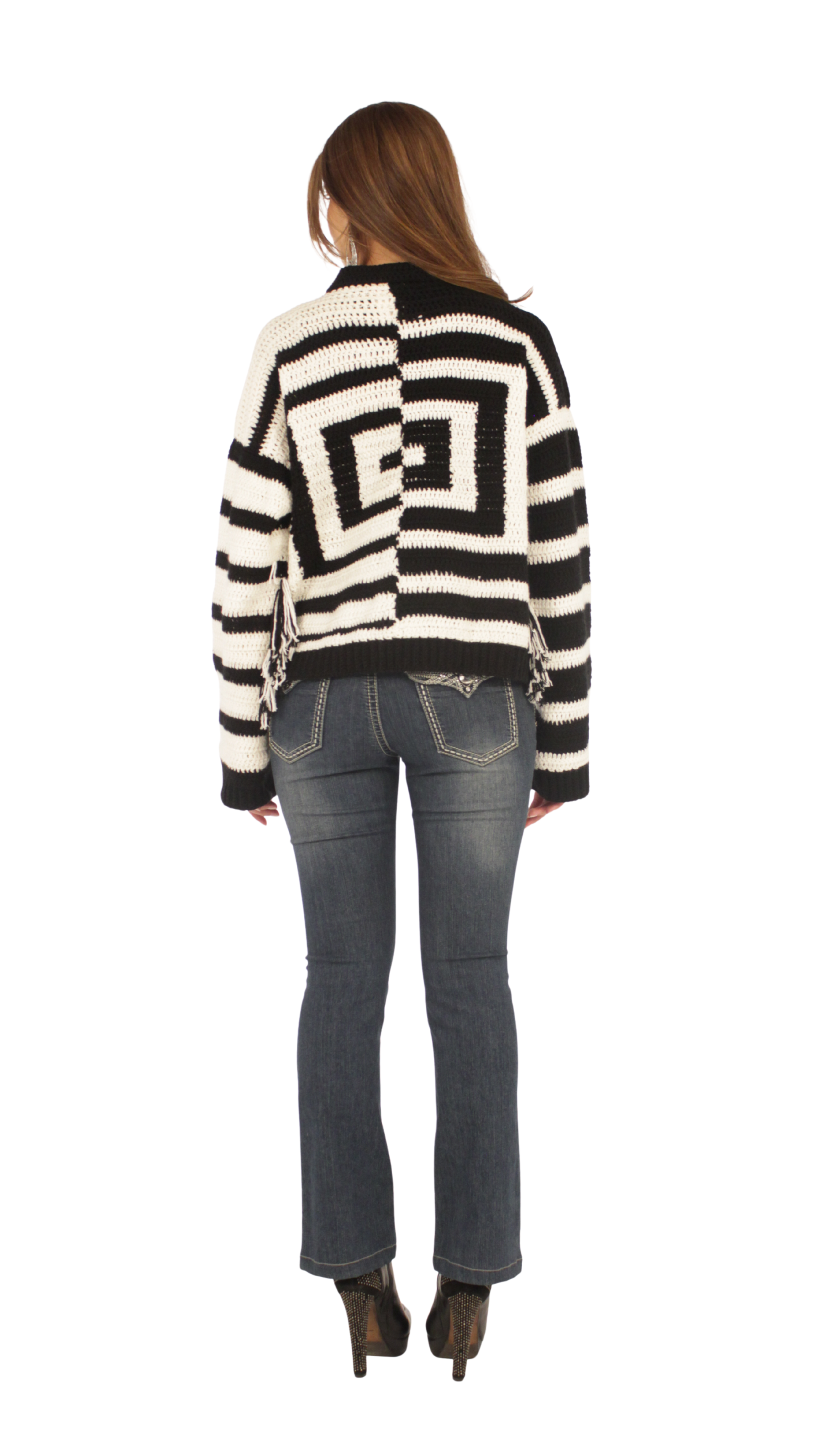 A combination of white and black featuring a striking maze pattern that creates a visually dynamic effect. Finished with subtle sequins that add just the right amount of sparkle and playful fringes for movement, this piece brings bold design and texture together in a truly standout way.